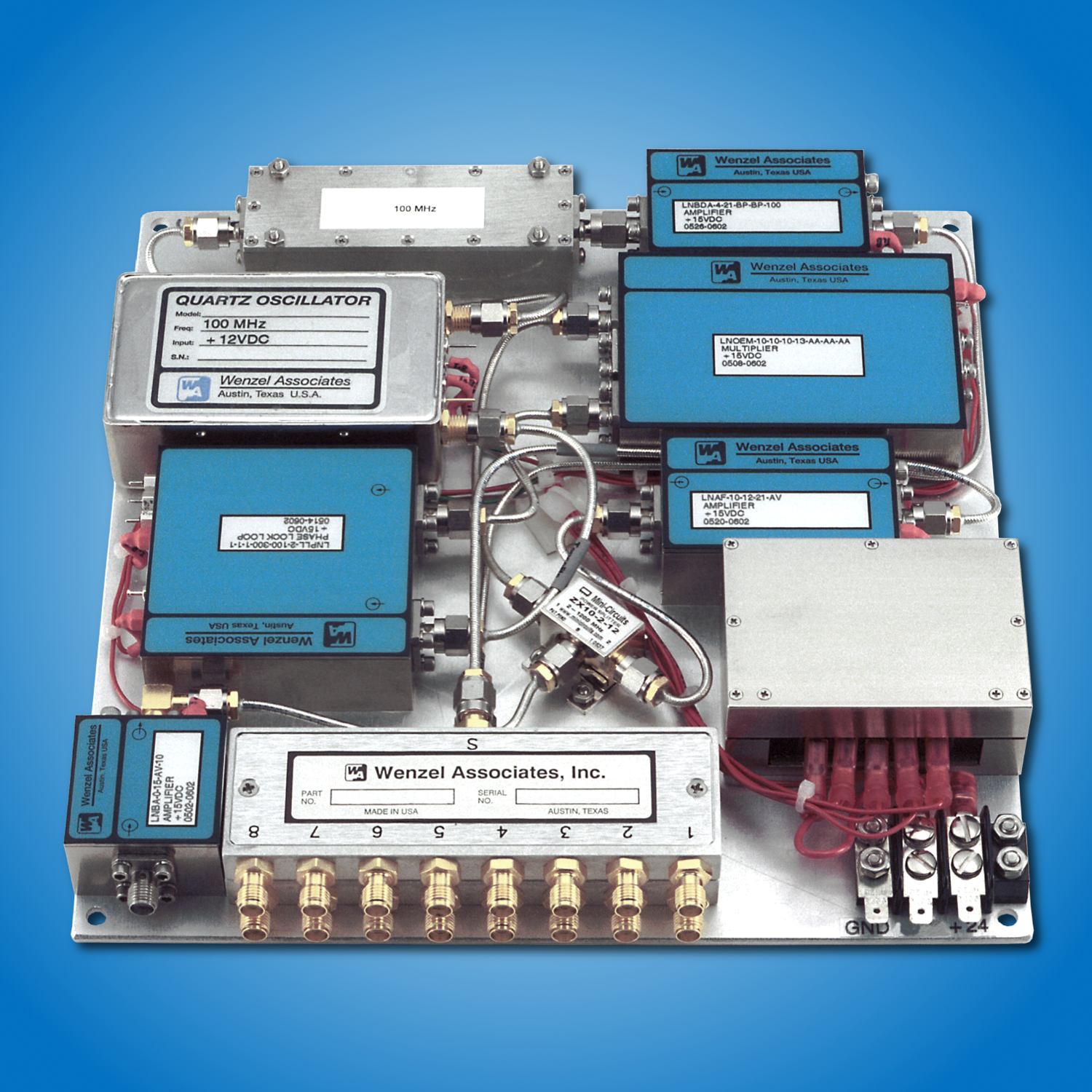 Wenzel Associates offers plate assemblies which are comprised of one or more industry leading Ultra Low Noise Ovenized Crystal oscillators, Blue Tops RF Modules and other hardware mounted on an aluminum plate, to provide a high performance frequency source with unparalleled phase noise performance at frequencies to 16 GHz. These plates are suitable for use as a bench top frequency standard or mounting within a larger assembly as part of a system.